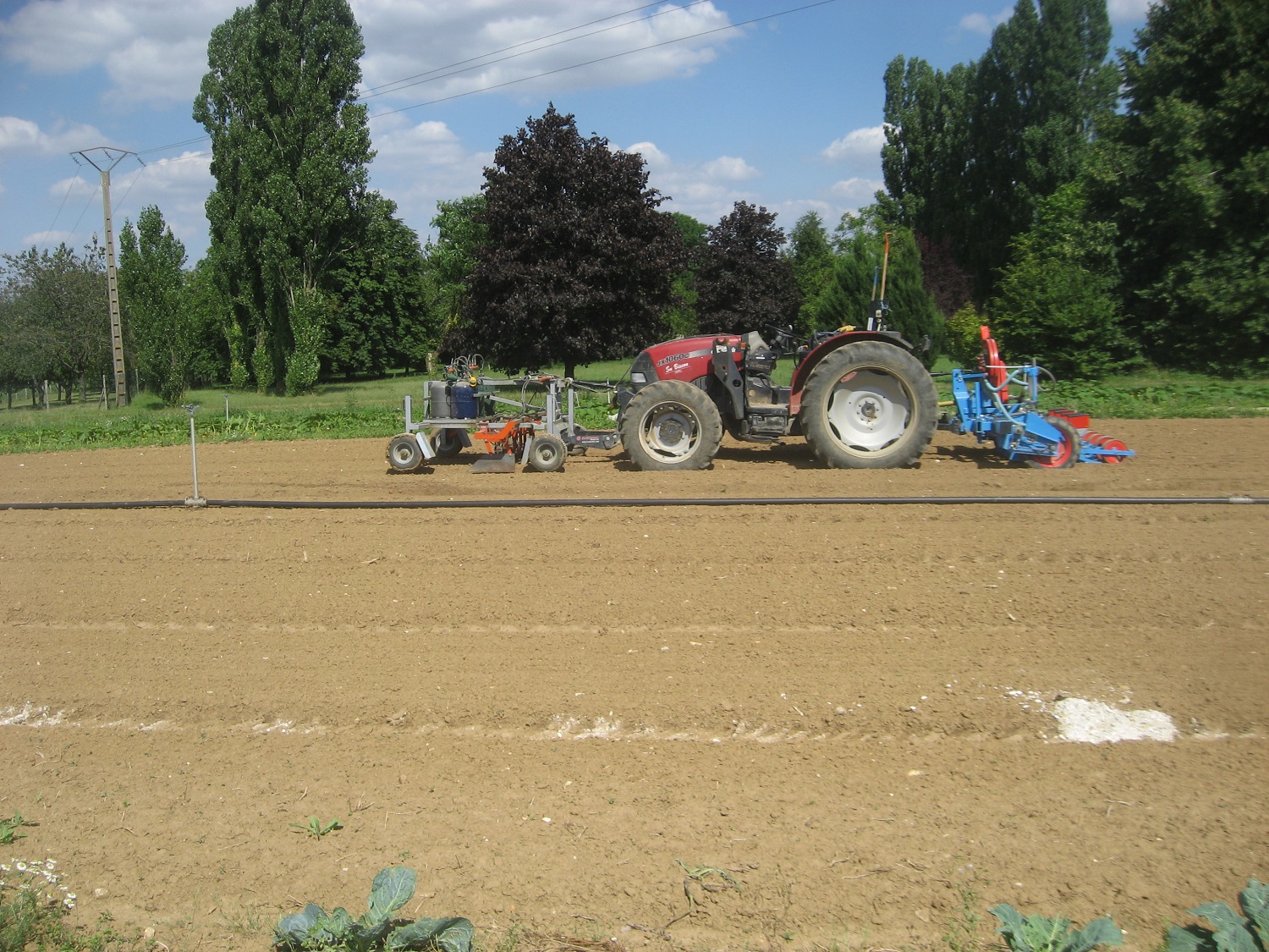 Coté météo, on a enfin un temps qui va à peu près, pour une fin juin (bah oui tout est en retard d’un mois alors on a décalé le calendrier, c’est plus simple) même si le moindre faux pas se voit tout de suite. Par exemple trois jours de nuits à 14 degrés et c’est illico le mildiou qui se remet à faire des dégâts sur les tomates! Sinon, le pire c’est… qu’il faudrait qu’il pleuve! Vous allez penser qu’on est maso hein? En fait, les racines sont peu développées et la terre après s’être gonflée de pluie se craquelle en perdant le volume d’eau qu’elle avait emmagasiné. Et ça, c’est pas bon pour les racines chétives des cultures. Quant au travail du sol il n’est pas évident dans ces conditions.